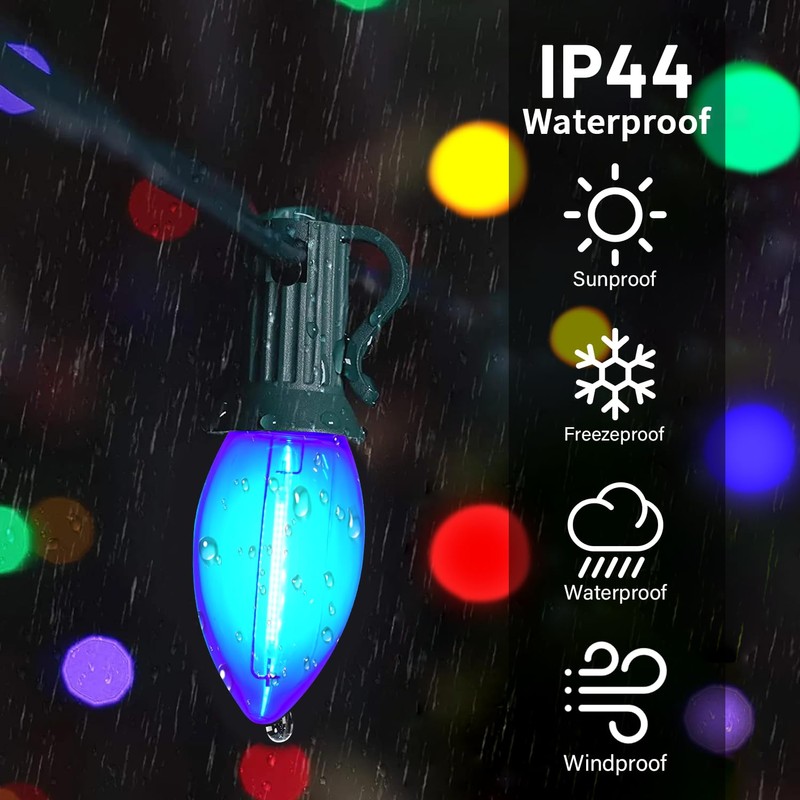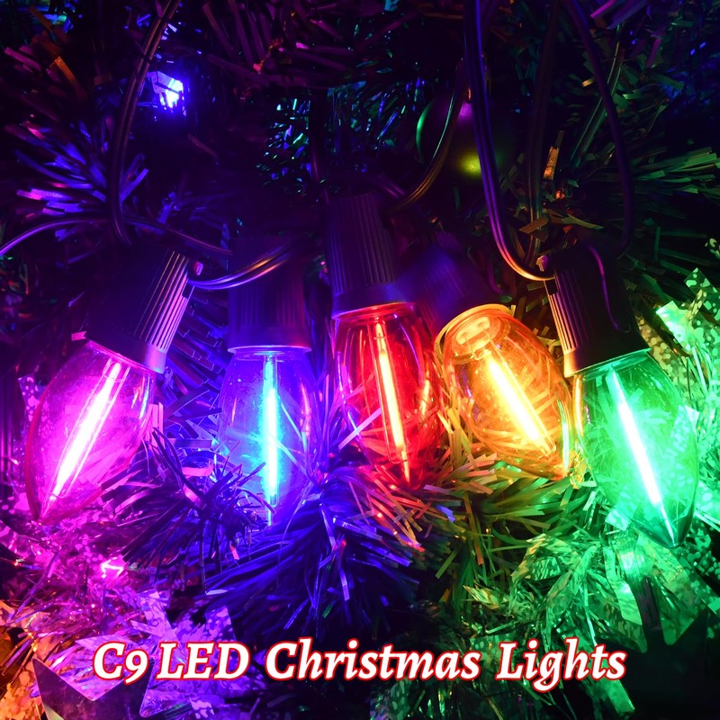 - 【C9 LED Colorful Christmas String Lights】: C9 LED colorful clear Christmas bulbs have a housing made of plastic, each classic bulb has a power of 0.6 watts with an E17 intermediate base. Our outdoor colorful Christmas lights can easily withstand all kinds of extreme weather, use it without being affected by weather conditions, and the plastic shell is not easy to break when dropped.