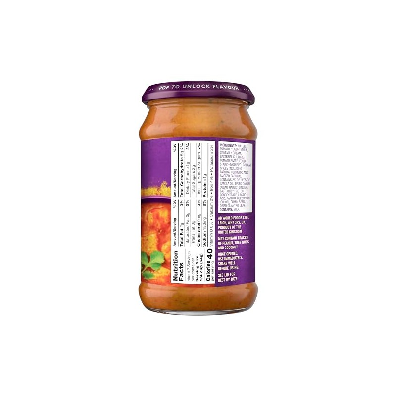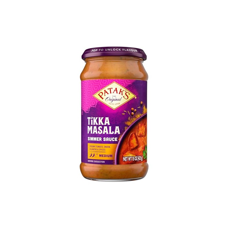 Enjoy Patak's Tikka Masala Curry Cooking Sauce, Medium. Original. An Authentic Indian Recipe. Tastes Of India. Suitable For Vegetarians. Gluten Free. Product Of The United Kingdom. (Note: Description is informational only. Please refer to ingredients label on product prior to use and address any health questions to your Health Professional prior to use.