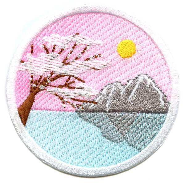 Add this Cherry Blossom Tree With Mountains embroidered patch to your collection.