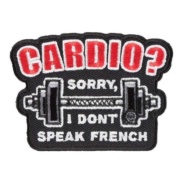 - This Cardio? Sorry, I Don't Speak French patch measures 3" W x 2.25" H (7.6cm x 5.7cm)