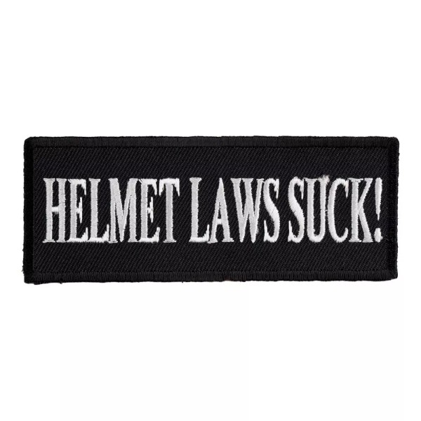 "HELMET LAWS SUCK" biker patches embroidered in white on a black patch.