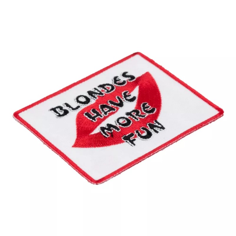 "BLONDES HAVE MORE FUN" ladies decorative patches with embroidered red lips.