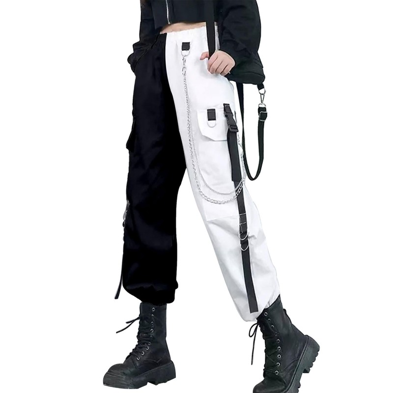 - [Feature] Special black and white patchwork pants design, highlighting your personality. High waisted cargo pants with chain, streetwear pants for women. The high waist overalls design with wide legs shows off your figure and creates a sexy and trendy look. The elastic waist ensures a perfect fit, and the multiple pockets provide ample storage space. Put on these emo pants and embrace a cooler and casual style