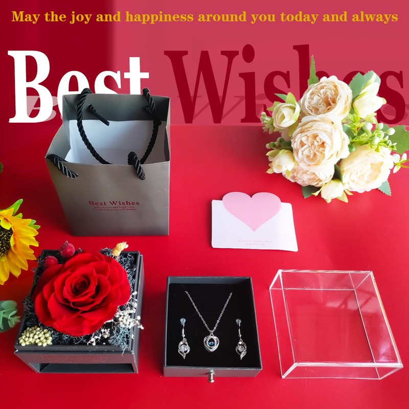 - Creative Gift Set The exquisite eternal roses create a romantic atmosphere. A heart shaped necklace with rhinestone earrings. The pendant in the middle mimics a beating heart and gives the jewellery a creative and romantic touch. Two intricately designed rhinestone earrings complement the necklace. A heartfelt greeting card is included to convey your feelings and enhance the emotional impact of the gift.