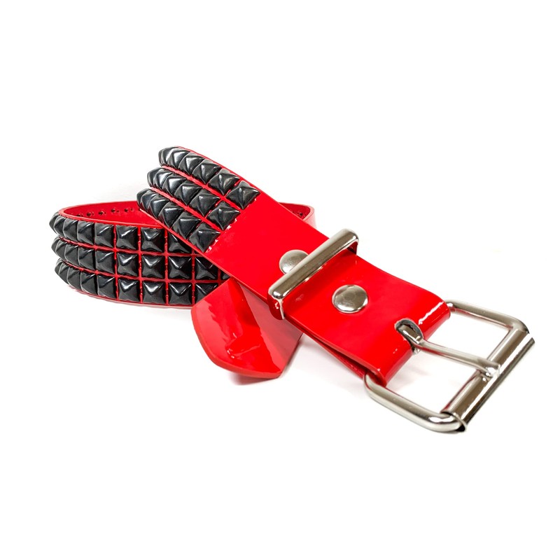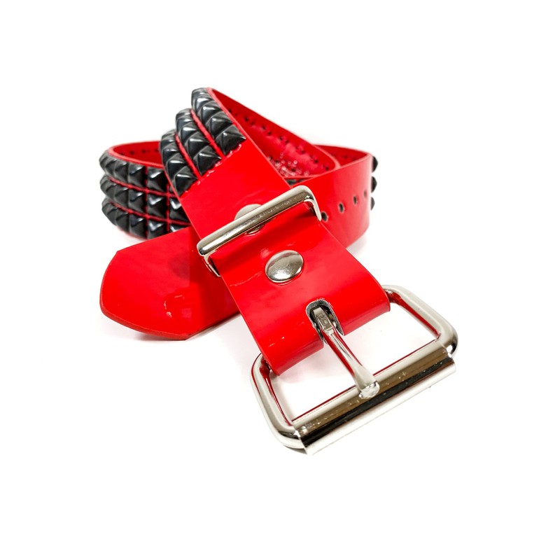 Patent Red Three Row Black Pyramid Stud Belt Vegan Leather Punk Goth Alternative USA Made (XL)