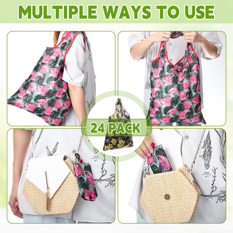 • Fresh Patterns: 24 reusable shopping bags, 24 fresh patterns and exquisite prints, can meet a variety of personal aesthetic needs suitable for women and men; Suitable for use as party gift bags, presenting a stylish and generous aesthetic