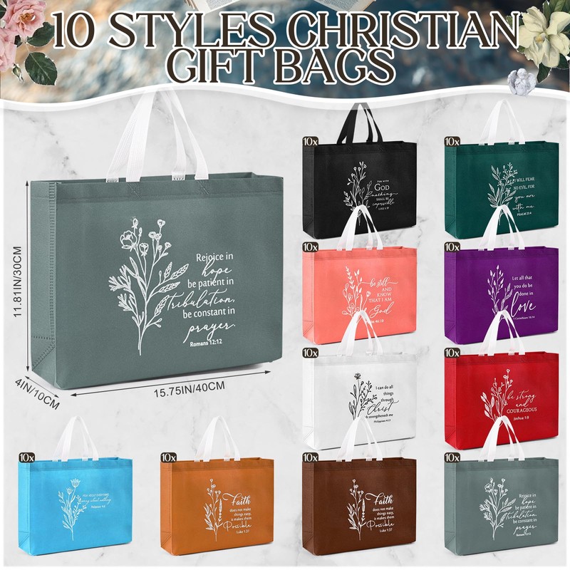 This set offers 10 Christmas - colored large church tote bags, each with a Bible - themed logo and three bags per logo. The diverse styles and rich colors can meet most people's aesthetic preferences. Wrapping gifts in these elegant, eco - friendly Christ - themed bags is sure to surprise churchgoers, friends or family. Ideal for numerous religious and holiday events like baptisms, prayer meetings, Easter, wedding parties, Mother's Day, etc., these bags will be cherished and reused by the recipients.