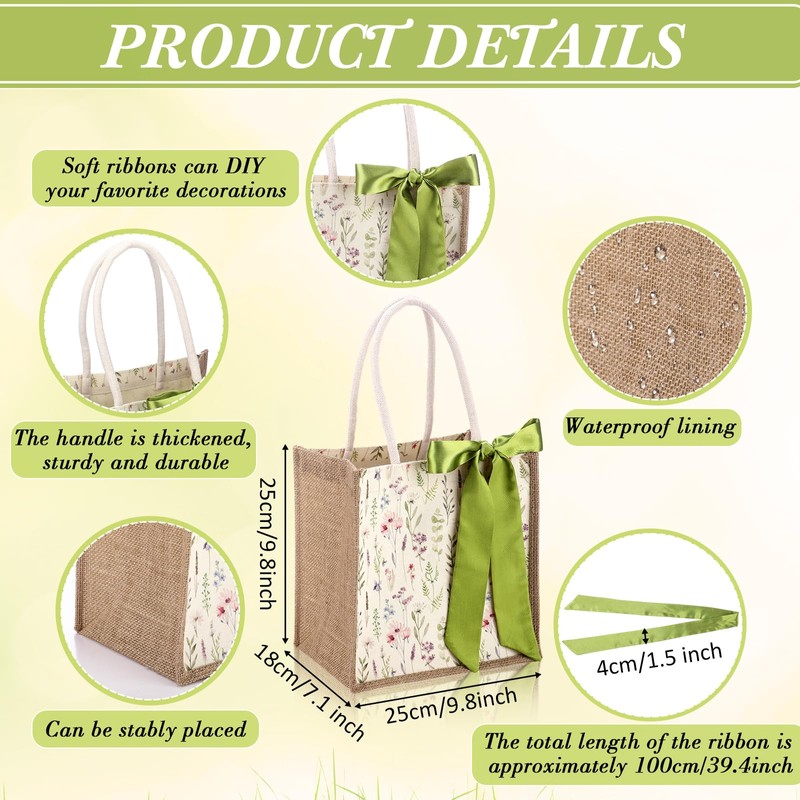 - Suitable Size: the size of the jute gift bag is about 9.84 x 9.84 x 7.09 inches/ 25 x 25 x 18 cm, with an about 1.57 x 39.37 inches/ 4 x 100 cm (W x L) green ribbon, providing ample space to hold a variety of items, such as wallets, cosmetics, clothes, towels, snacks, and smartphones; Its adaptability makes it ideal for grocery shopping, beach trips, library visits, commuting to work, exercising, and casual outings