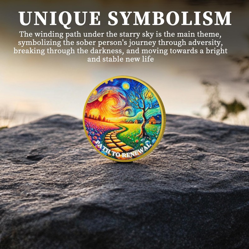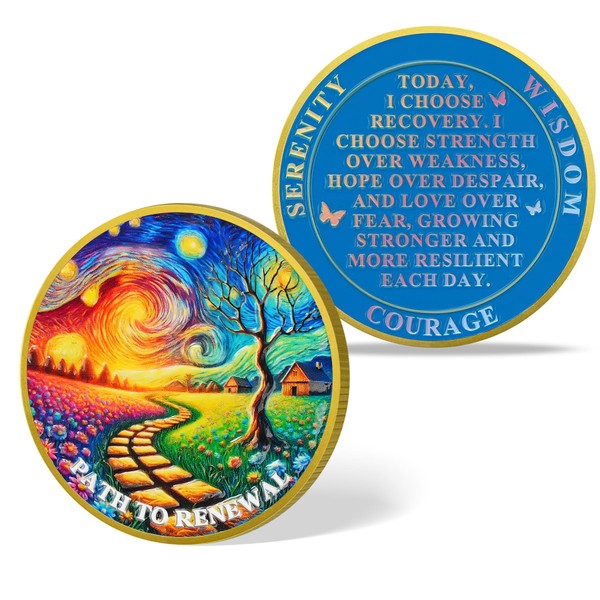 - INSPIRATIONAL MESSAGE: The AA coin features a winding path beneath a star-filled sky, flanked by blooming flowers and trees. The words “PATH TO RENEWAL” symbolize the journey from hardship to a brighter, more stable life. On the back, a butterfly represents transformation, accompanied by the Serenity Prayer. Together, they remind us of unwavering faith, embodying rebirth, resilience, and self-determination in sobriety. This sobriety coins inspires those battling alcoholism, offering hope and courage every step of the way