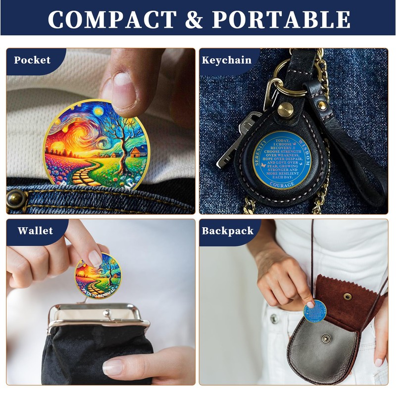 - PORTABLE SIZE: Measuring 1.38 inches in diameter and 0.12 inches thick, these sobriety chip are made from high-quality zinc alloy for durability and wear resistance. Compact and easy to carry, they fit perfectly in your pocket, purse, or wallet. Carrying this sober coin serves as a constant reminder of your commitment to sobriety, reinforcing your resolve and keeping your goals in focus