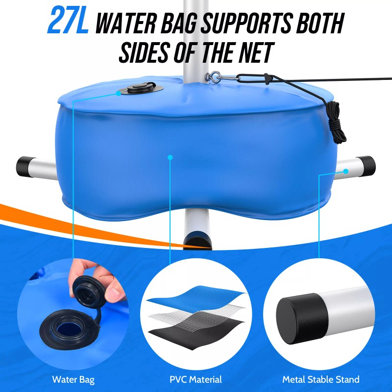 💯🔅 No Sagging, No Sliding--Unlike traditional hard plastic bases, our pool volleyball net system is made of leak-proof, thickened PVC material to ensure its durability. Each base can hold 27 liters of water, keeping the net upright and preventing it from tipping over. Just pour out the water and fold it up for easy storage and carrying