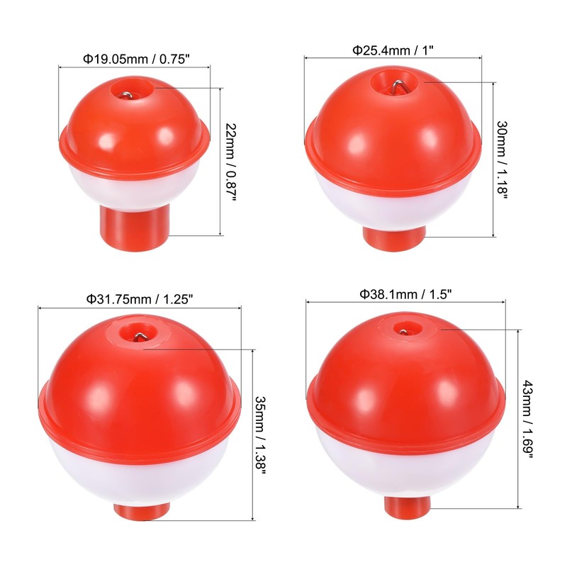 - Size: Diameter: 0.75 inch, 1 inch, 1.25 inch, 1.5 inch; Height: 22mm / 0.87 inch, 30mm / 1.18 inch, 35mm / 1.38 inch; 43mm / 1.697 inch; Packing List: 20 x Fishing Bobber(5pcs per size)