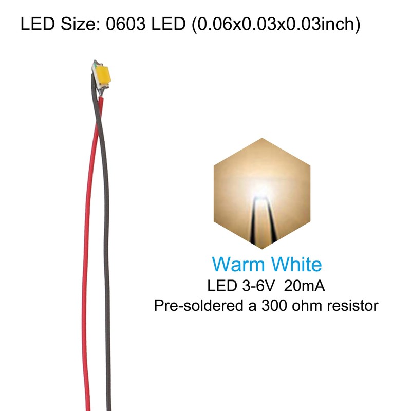 - Specification: Light Color: Warm White; Rated Voltage: 3-6V; Resistance Value: 300 ohm; Current: 20mA; LED Size: 0603 LED (0.06x0.03x0.03inch); Wire Length: 25cm/ 9.8 inch; Package List: 24 Pcs x Pre-Wired Micro LED