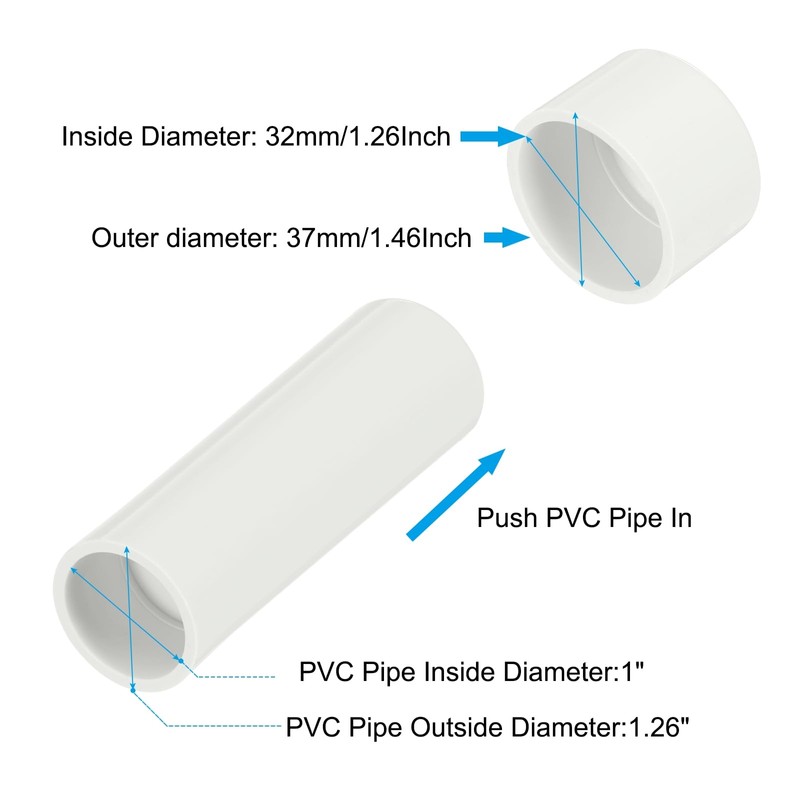 - Color: White; Material: PVC; Size: 22x37x2.5 mm/0.87x1.46x0.1 Inch(LxDxT); Inside Diameter: 32 mm/1.26 Inch; Packing List: 10 Pcs x PVC Pipe End Cap Fitting