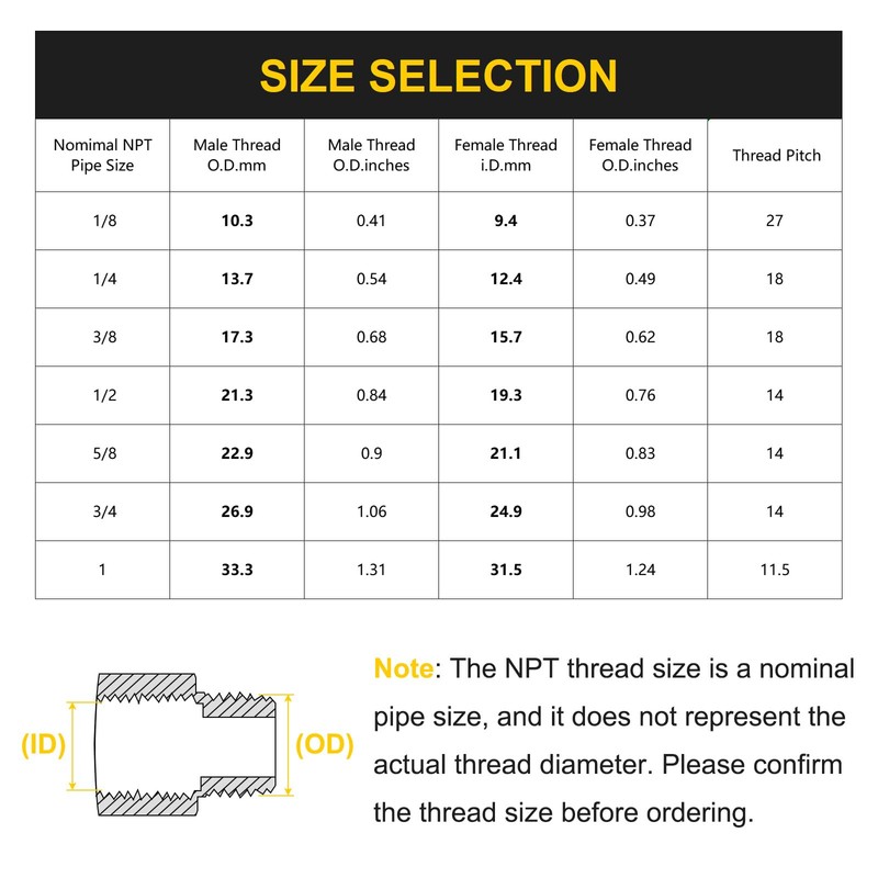 The NPT thread size is a nominal pipe size, and it does not represent the actual thread diameter. Please confirm the thread size before ordering.