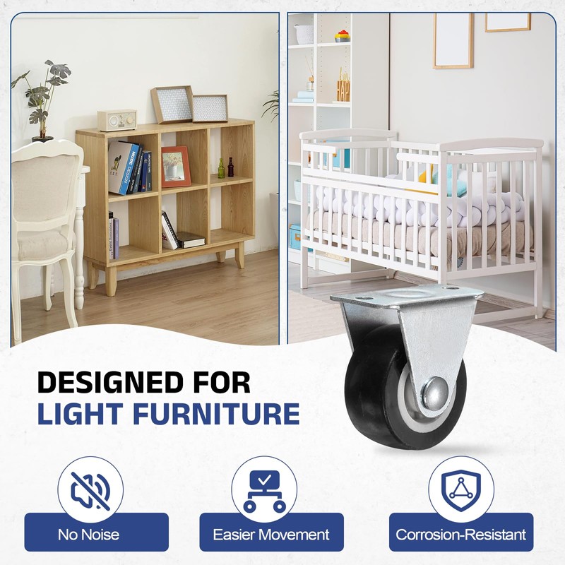 - APPLICATION: Fixed casters are perfect for various uses, DIY applications, Home, office, garage, shop, etc. Low profile casters for small equipment and small space furniture, including chairs, coffee tables, plant stands, bookshelves, kitchen cabinets, spice cabinets, shoe boxes, toy boxes, trolleys, workbenches, under-bed storage cabinets and other furniture.