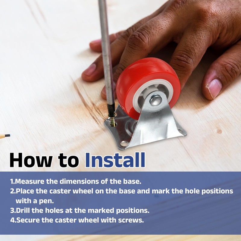 - PACKING LIST: : 4pcs casters (4 screws included for each caster); Wheel diameter: 31mm / 1.22 inch; Wheel width: 14mm / 0.55 inch; Mounting height: 38mm / 1.5 inch; Base plate dimensions: 21x37mm / 0.83x1.46 inch. Fixed casters can be easily and conveniently installed to meet a variety of needs.
