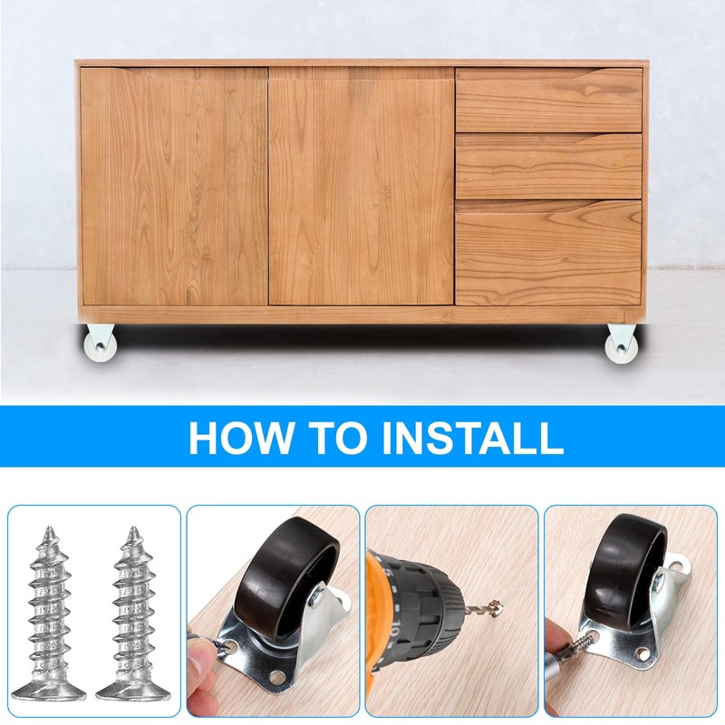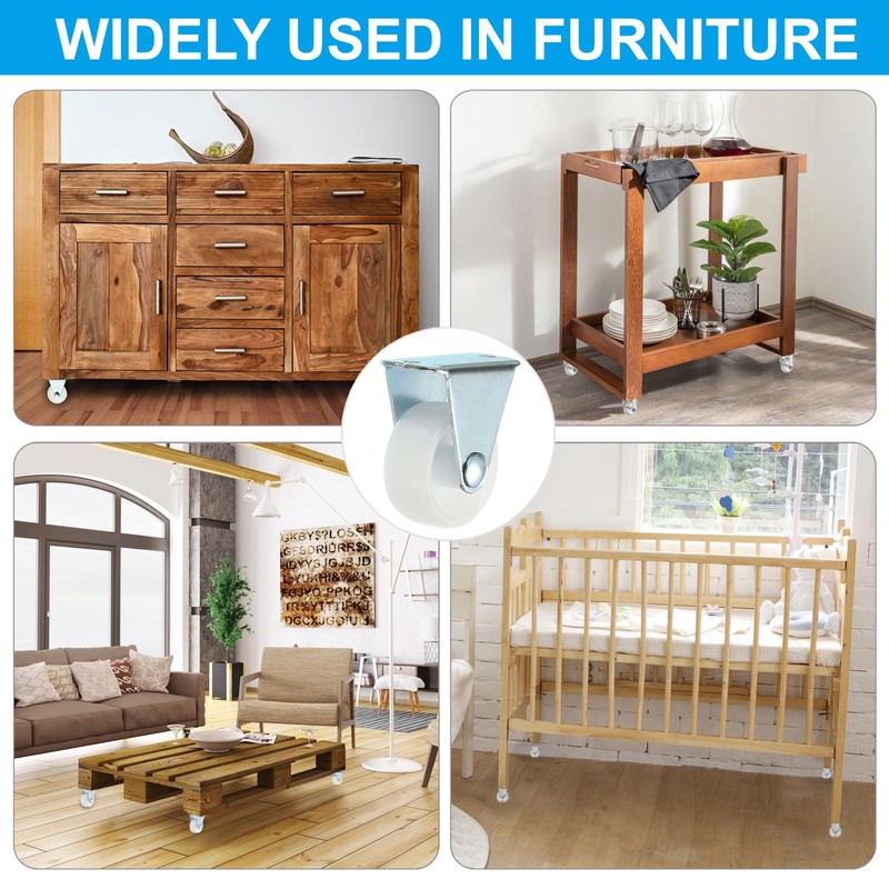 The plate caster wheels are designed to replace old and broken wheels on desks, storage racks, chairs, lockers, shoe racks, bookshelves, cabinet, trolley, small machinery, and other furniture. Widely used in homes, offices, libraries, bars, shops, etc.