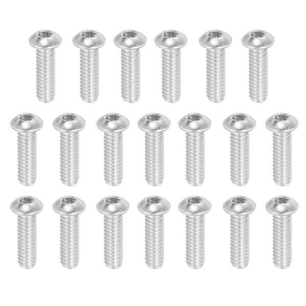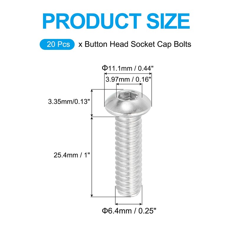 • Material: 304 Stainless Steel; Thread Diameter: 1/4 Inch; Thread Count: 20 UNC; Screw Length: 1 Inch (excluding the height of the head); Diameter of the head: 11.1 mm / 0.44 Inch; Height of the head: 3.35 mm / 0.13 Inch; Drive Style: 3.97 mm / 0.16 Inch Allen hex; Packing List: 20 Pcs x Button Head Socket Cap Bolts