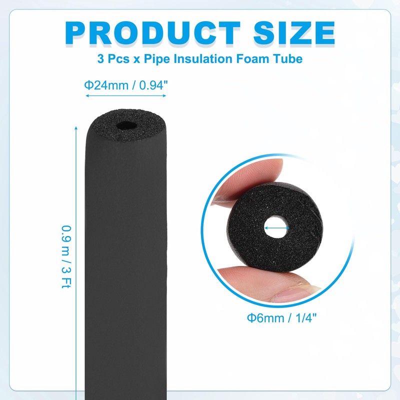 - Color: Black; Material: Nitrile Rubber; Size (Inner Dia x Outer Dia): 6 x 24 mm (1/4" x 0.94 Inch); Length: 0.9 m / 3 Ft; Thickness: 9 mm/ 0.35 Inch; Package List: 3 Pcs x Pipe Insulation Foam Tube