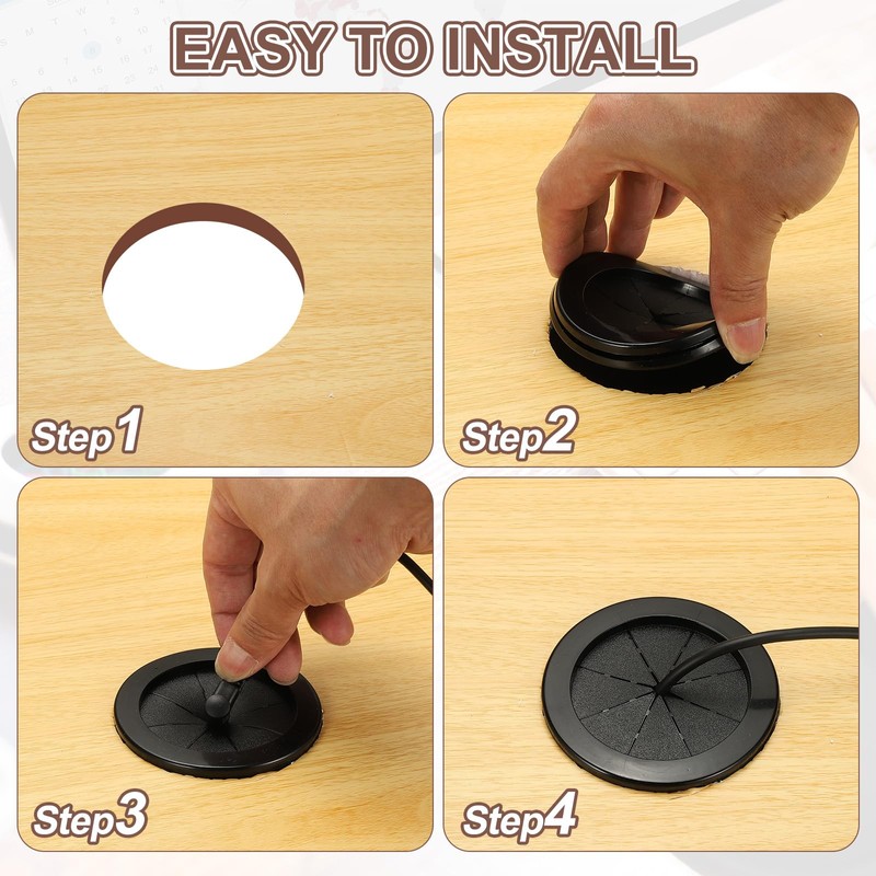 - Instruction: The cable hole grommet is designed for quick and easy installation without special tools. Simply insert the grommet into a pre-drilled hole in your desk or tabletop, and it securely holds in place, ready to manage your cables effectively.