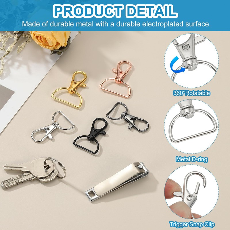- Application: These Swivel Clasps Clips are equipped with 360-degree rotation lobster clasps and D-rings. Suitable for various DIY crafts, making purses, handbags keychain crafts, key rings, embroidered key chains, lanyards, leather accessories, etc.