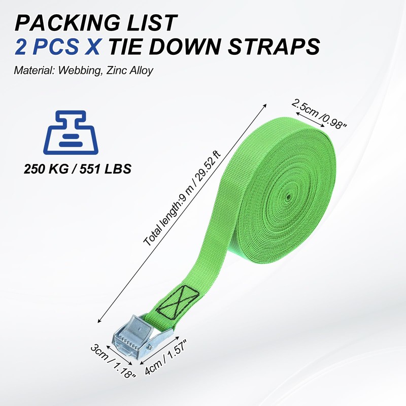 - Straps Width: 2.5 cm / 0.98 Inch; Straps Length: 9 m / 29.52 ft; Buckles Size: 4 x 3 cm / 1.57 x 1.18 Inch (L*W); Maximum Load Capacity: 250 kg / 551 lbs; Packing List: 2 Pcs x Tie Down Straps