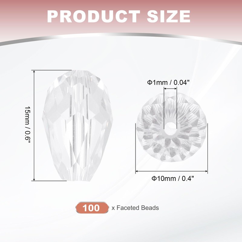- Color: White; Material: Glass; Size: 0.4 inch / 10 mm width, 0.6 inch / 15 mm length, hole size: 1 mm; Package list: 100 x Faceted beads