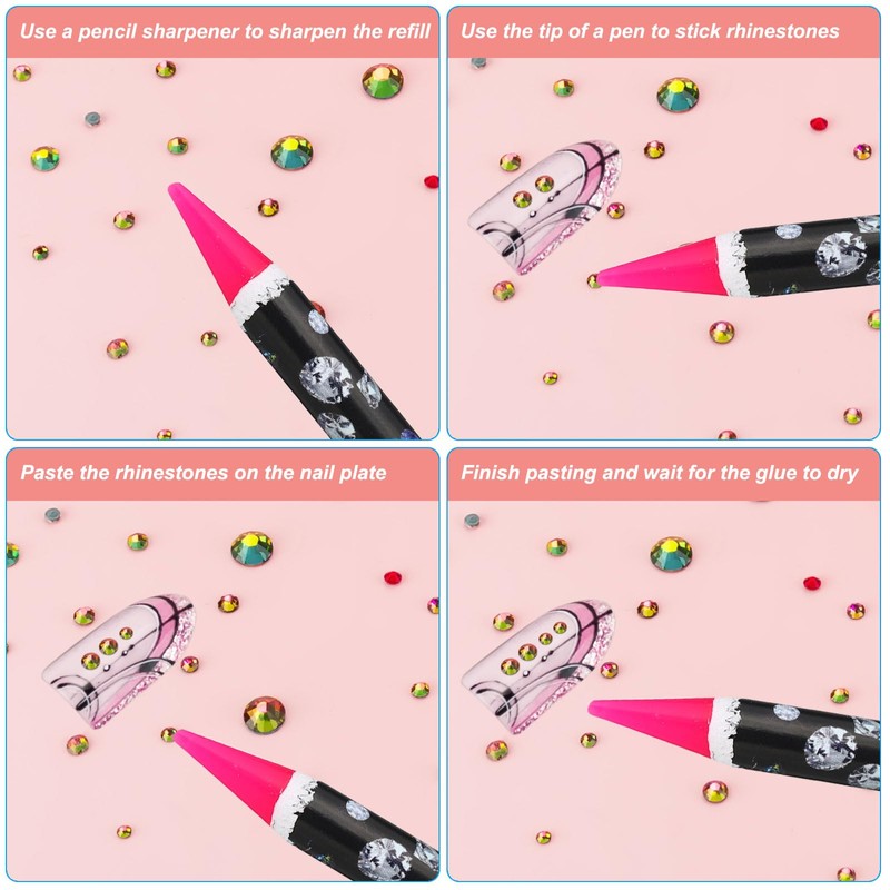 - Instruction: Use a pencil sharpener to sharpen the refill. Put the rhinestones you want to paste on the tip of the pen. Paste the rhinestones on the nail plate. Finish pasting and wait for the glue to dry.