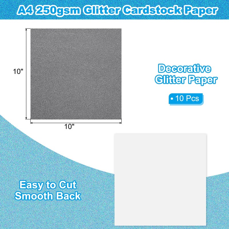 - PREMIUM GLITTER CARDSTOCK: You will get 10 sheets of Grey glitter paper, these sheets are Square 10 x 10inch(25.5 x 25.5cm), each sheet is of thick quality, weighing up to 250gsm/92lb thick, with excellent texture and feel, perfect for decorating and packaging use.