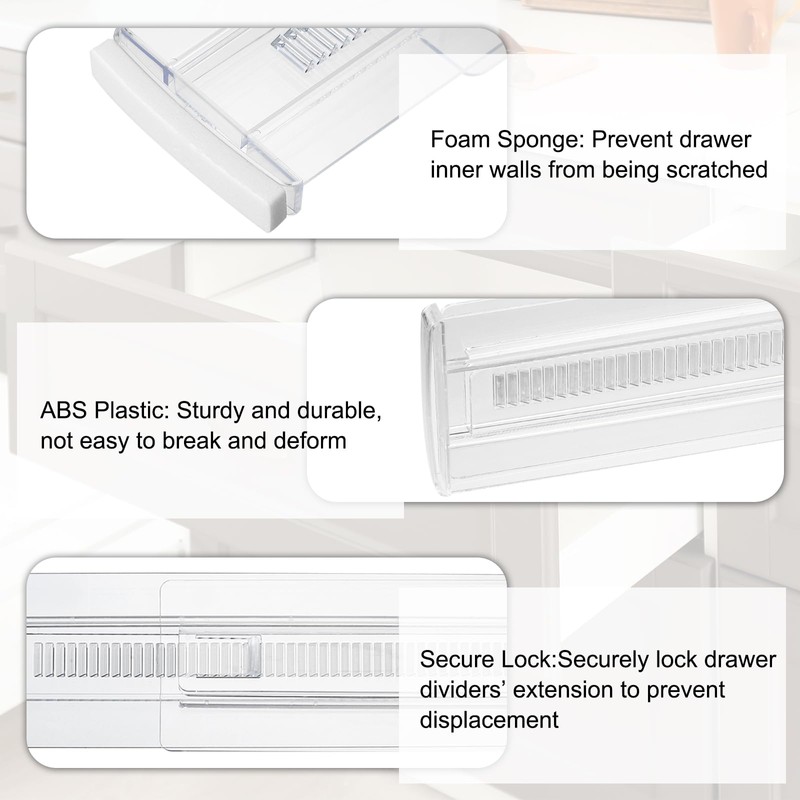 - Advantage: Adjustable design, the expandable drawer dividers are composed of long dividers and short inserts, and can be stretched to the required length in a certain range, making it easy to install in different types of drawers. Made of ABS plastic, the drawer dividers are sturdy and durable, with foam sponges on both sides to prevent drawer inner walls from being scratched.