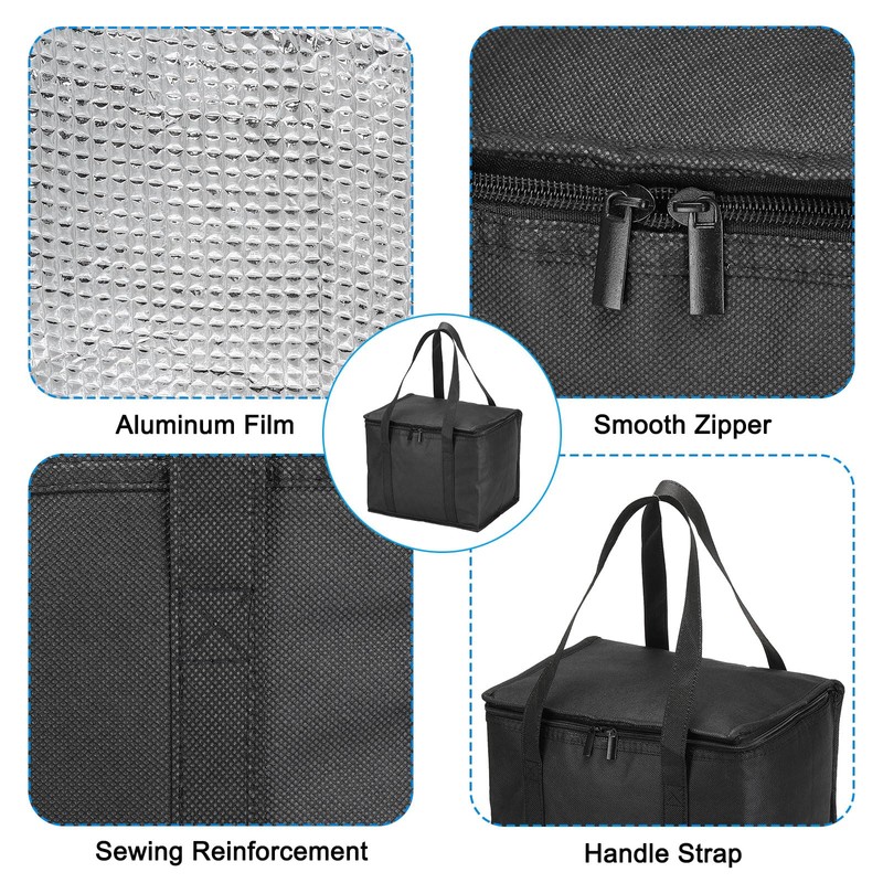 - Advantage: The foldable insulated food delivery bag is made of non-woven fabric, which is durable, tear-resistant and has big capacity. The interior is equipped with thermal insulation cotton and aluminum film effectively keeping warm and cold, waterproof and easy to clean. Zipper on the side, easy to open and close. The sturdy handle strap design is convenient for carrying.