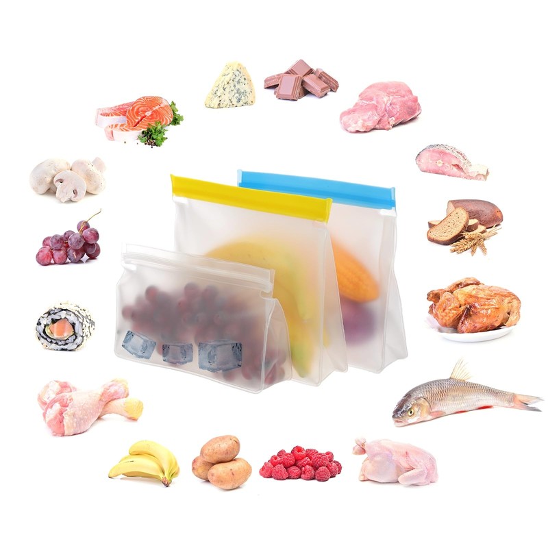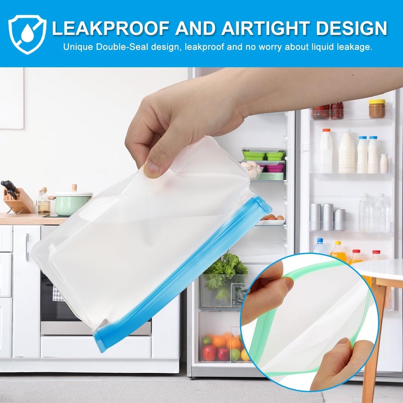 - Advantage: Leakproof and Airtight Design: With a unique Double-Seal design and the airtight feature, these reusable bags are leakproof and easy to open and close, keeping food fresh for a longer period. Freezer Compatibility: Crafted from PEVA, the reusable bags are safe for storing food. It is also low-temperature resistant, preserving the flavor of your food in the fridge. Stand-up Bottom Design: The reusable freezer Bag can stand up in the fridge, making it easier to organize your food items.