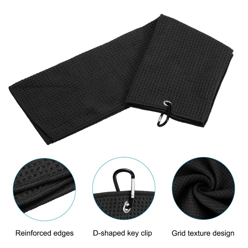 - Advantage: This tri-fold golf towel is made of microfiber material, which is super absorbent and easy to clean. Reinforced edges, no off-line. Grid texture design, thick and no lint, durable and wrinkle-resistant. There are 3 hanging holes on the top of the towel, which can be folded and hung. At the same time, it is convenient to fold up and use, and it is not easy to fall apart when wiping.