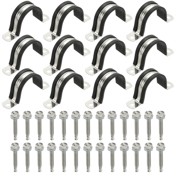PATIKIL 12Pcs Pipe Clamps, 1-9/16 Inch 304 Stainless Steel Rubber Cushioned U Bracket Conduit Clamps Pipe Strap Wire Clips with Hexagonal Screw for Tube Hose Cord Installation, 40mm
