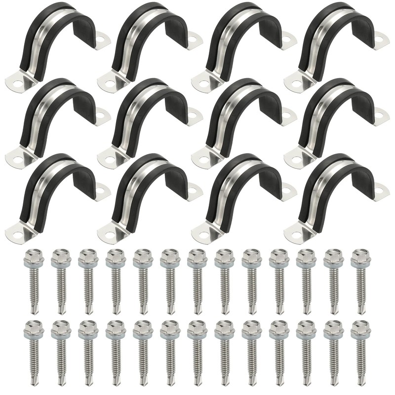 • Material: 304 Stainless Steel, Rubber; Inner Diameter: 40mm / 1-9/16 Inch; Screw Hole Diameter: 6mm / 1/4 Inch; Thickness: 0.6mm; Width: 18mm / 11/16 Inch; Packing List: 12pcs of pipe clamps, 26pcs of M5.5*32 self-tapping hexagon screws