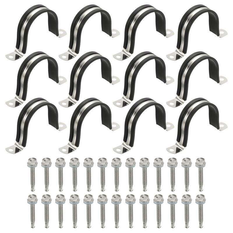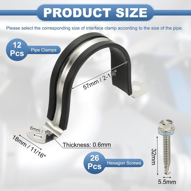 - Material: 304 Stainless Steel, Rubber; Inner Diameter: 57mm / 2-1/4 Inch; Screw Hole Diameter: 6mm / 1/4 Inch; Thickness: 0.6mm; Width: 18mm / 11/16 Inch; Packing List: 12pcs of pipe clamps, 26pcs of M5.5*32 self-tapping hexagon screws
