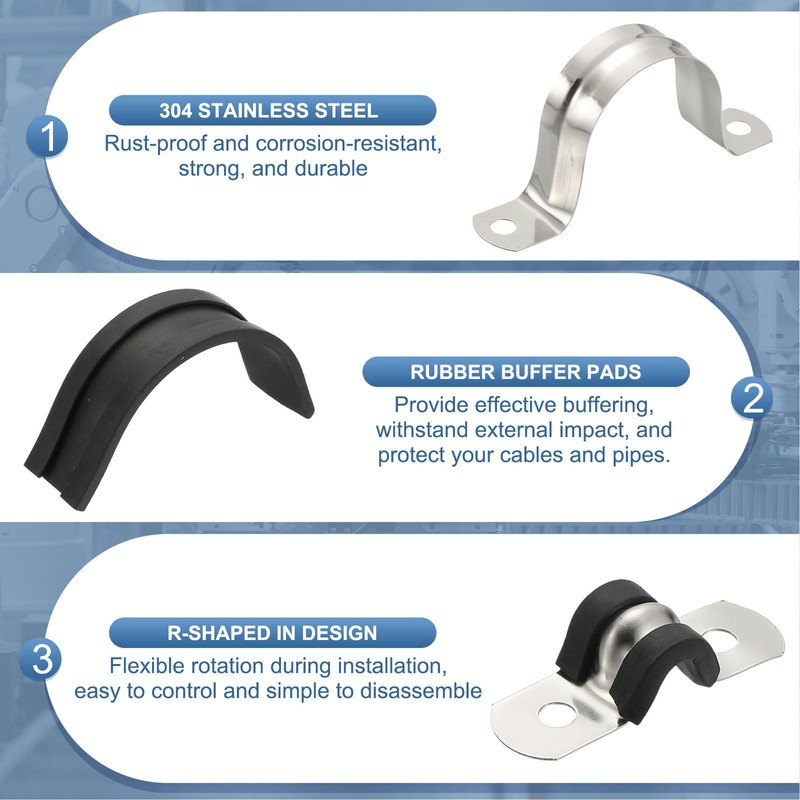 - Advantage: Our pipe clamps are made of quality 304 stainless steel, which is rust-proof and corrosion-resistant, strong, and durable. The pipe clamps are also covered with rubber buffer pads to provide effective buffering, withstand external impacts, and protect your cables and pipes