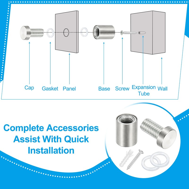 - Application:The sign bracket screw is a wall-mounted screw made of stainless steel, which is durable and corrosion-resistant. The standoff screws can be used to hang mirrors, photo frames, acrylic plates, and picture frames to meet your daily needs.