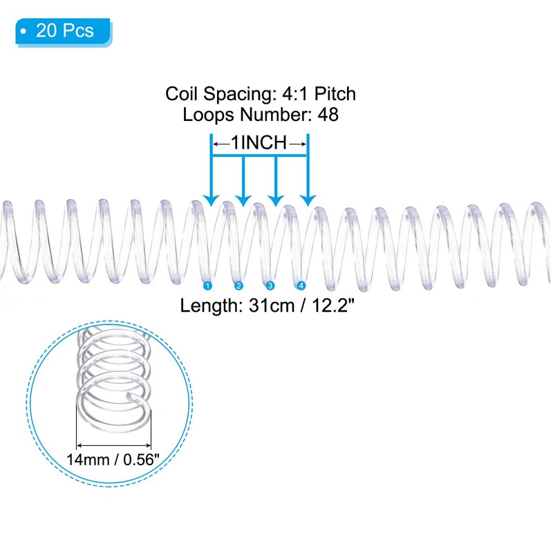 - Specification: Inner diameter: 14mm/0.56 inch; Length: 31cm/12.2 inch; Coil spacing: 4:1; Number of binding pages: 115; Material: plastic Color: Transparent; Packing List: 20 Pcs Plastic Spiral Binding Coils