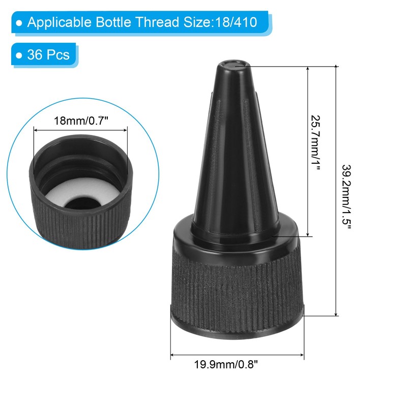 - Specification: Material: PP; Color: Black; Total Size: 19.9x18x39.2mm/0.8x0.7x1.5inch (Out Dia x Inner Dia x H); Tip Length: 25.7mm/1inch; Applicable Bottle Thread Size:18/410; Package List: 36Pcs x Twist Bottle Cap