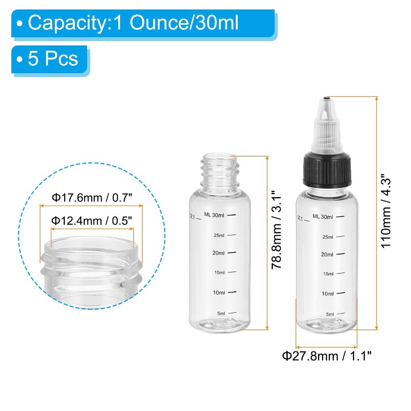 - Specification: Capacity:1 Ounce/30ml; Overall Size(inch): 110 x 27.8mm/4.3 x 1.1inch(H*OD); Bottle Height: 78.8mm/3.1inch; Mouth Inner Diameter: 12.4mm/0.5inch; Mouth Outside Diameter: 17.6mm/0.7inch; Color: Transparent(Bottle Body); Black(Bottle Cap); Material: Plastic; Packing List: 5Pcs x Dispensing Bottle