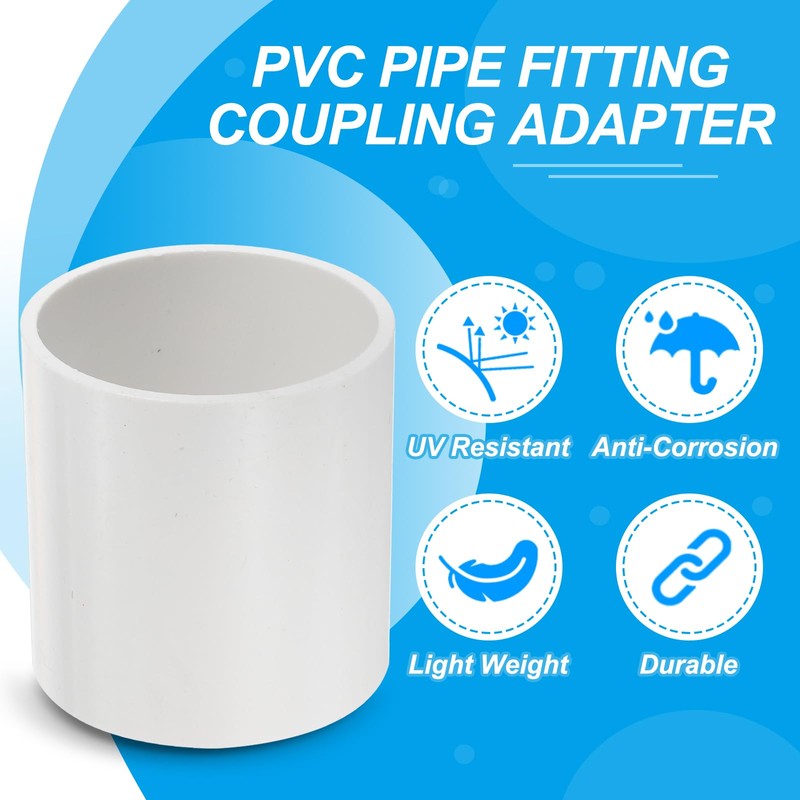- Application: White PVC pipe coupling adapters are suitable for indoor and outdoor use. They can be used in many applications, such as irrigation, underground sprinkler systems, swimming pools, pipe connections for cold water supply lines, and rainwater collection systems