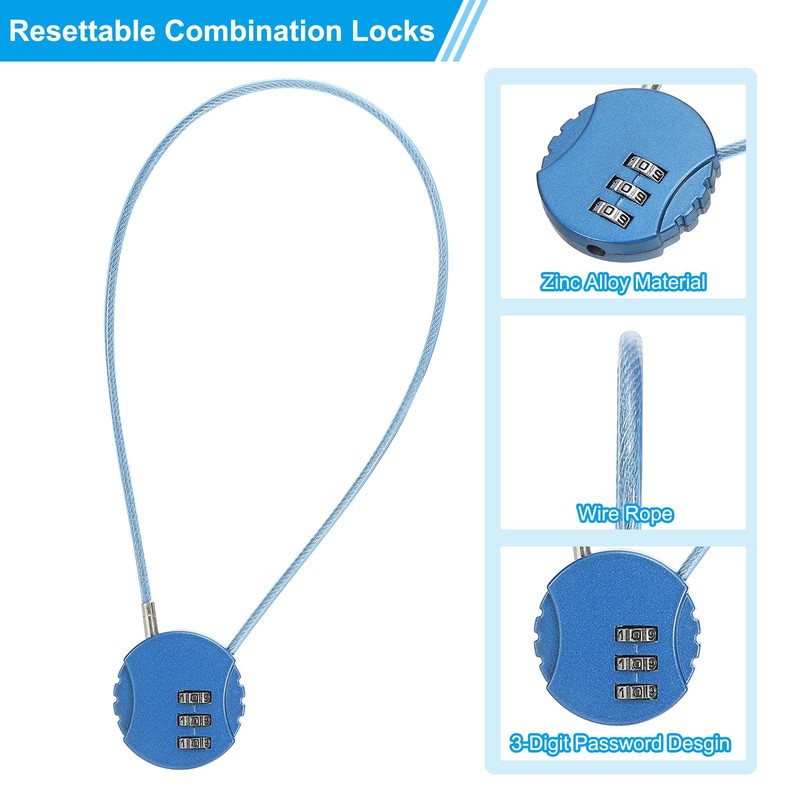 • Size: The lock steel cable stretched length is 0.4 m / 1.31 feet; steel cable diameter is 3 mm/ 0.12 inch; combination padlock length is 39 mm/ 1.54 inch; combination padlock width is 37 mm/ 1.46 inch; shackle thickness is 9 mm/ 0.35 inch; color is Blue; lock material is zinc alloy; cable material is steel; packing list is 2 x resettable combination locks