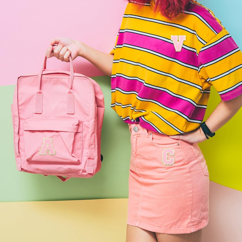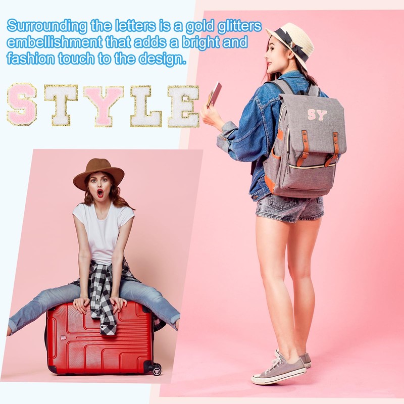 - Advantage: 1. The letter patches are crafted from intricate towel embroidery and non-woven fabric, washable. Surrounding the letters is a gold glitters embellishment that adds a bright and fashion touch to the design. 2. Chenille letter patches have heat sealant backing glue on the back, it is easy to use. You can use ironing or sew the patch directly. You can also use double-sided tape to stick directly (double-sided tape is not included)