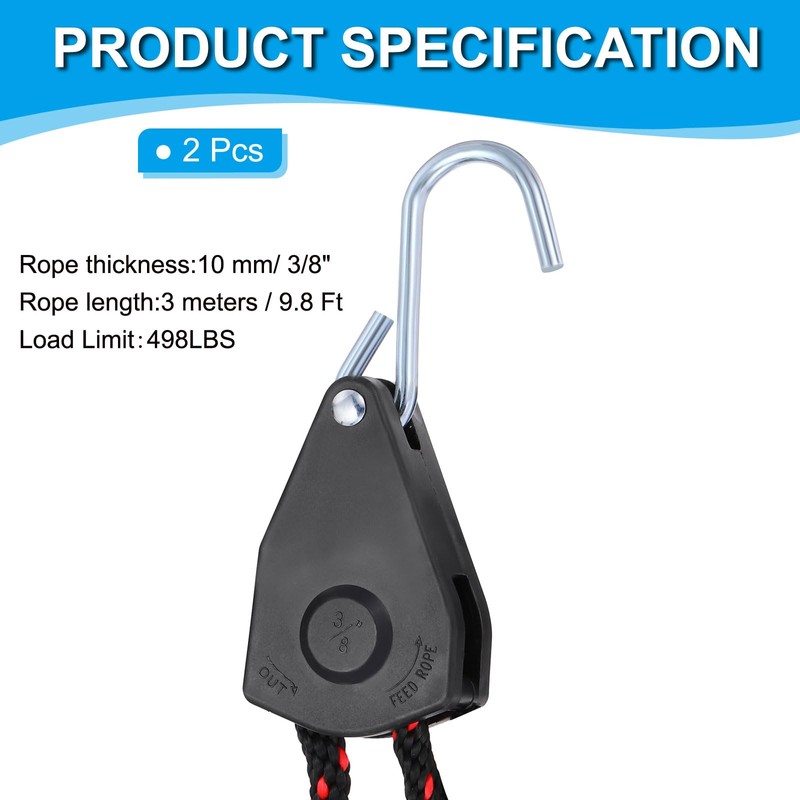 • Specification: Color: Red, Black; Material: Metal parts, ABS plastic; PACKING LIST: 2 Pcs of Rope Tie Downs Straps. Single piece rope thickness: 10 mm/ 3/8", rope length: 3m/ 9.8 Ft.