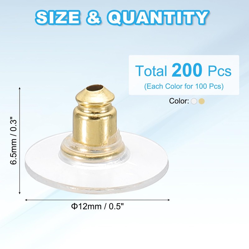 - Specification: Color: Gold Tone/Silver Tone; Material: Copper; Size: 12x6.5mm/0.5x0.3inch; Hole Diameter: 0.7mm / 0.03inch; Packing List: 200 Pcs x Earring Backs (Each Color 100 Pcs)