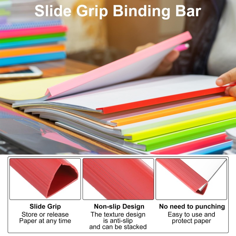 - Advantage: These binding bars are made of plastic, durable and reusable, and you can even cut them with scissors to fit your paper. They come in a variety of colors, so you can sort and organize your documents by using different colored binding bars. The binding bars' surface is specially treated as non-slip. The part that contacts the paper surface feels smooth and will not scratch your documents. The clamping force of these binding strips is very strong, and the documents will not fall off