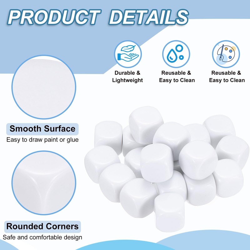 - Advantage: Crafted from acrylic, these blank dice are durable, lightweight, and impact-resistant, ensuring long-lasting use. Their smooth, splinter-free surfaces are easy to draw on, paint, or glue, while the rounded corners enhance security. Suitable for repeated use, they can be easily cleaned and customized for various creative or educational purposes.