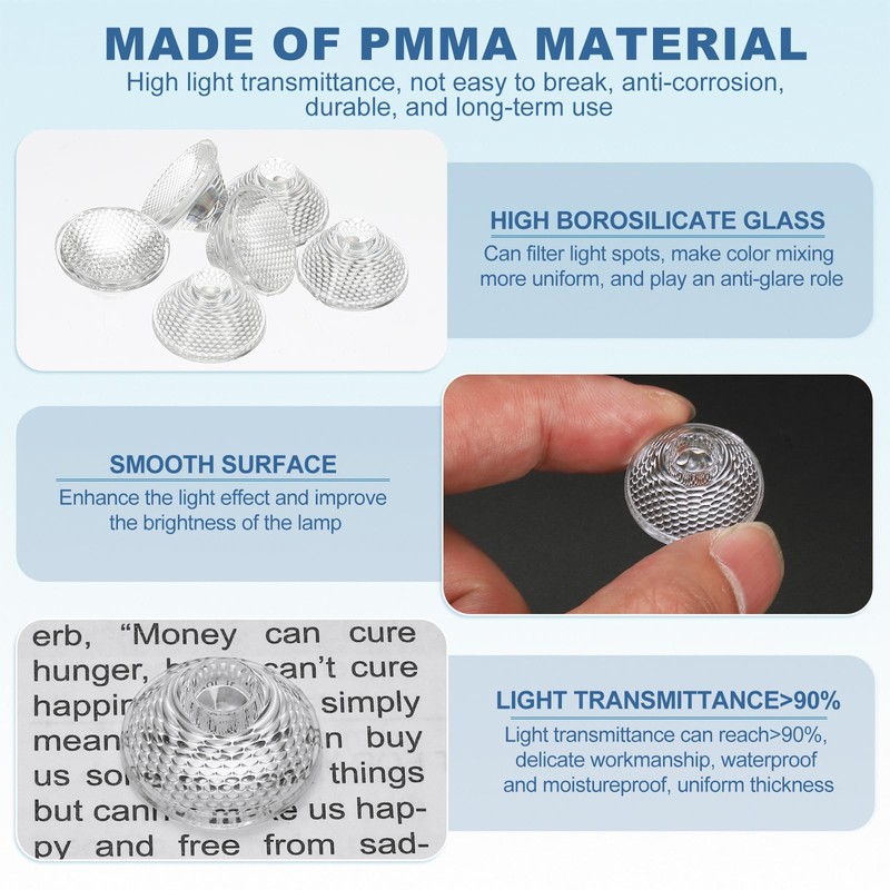 - Advantage: Made of Optical acrylic material, it has high light transmittance, is not easy to break, is corrosion-resistant, durable, and can be used for a long time; With a light transmittance of up to 90%, the lens can maximize light output and achieve brighter lighting. The lens surface is a beaded surface, which can filter light spots, make color mixing more uniform, and play an anti-glare role.